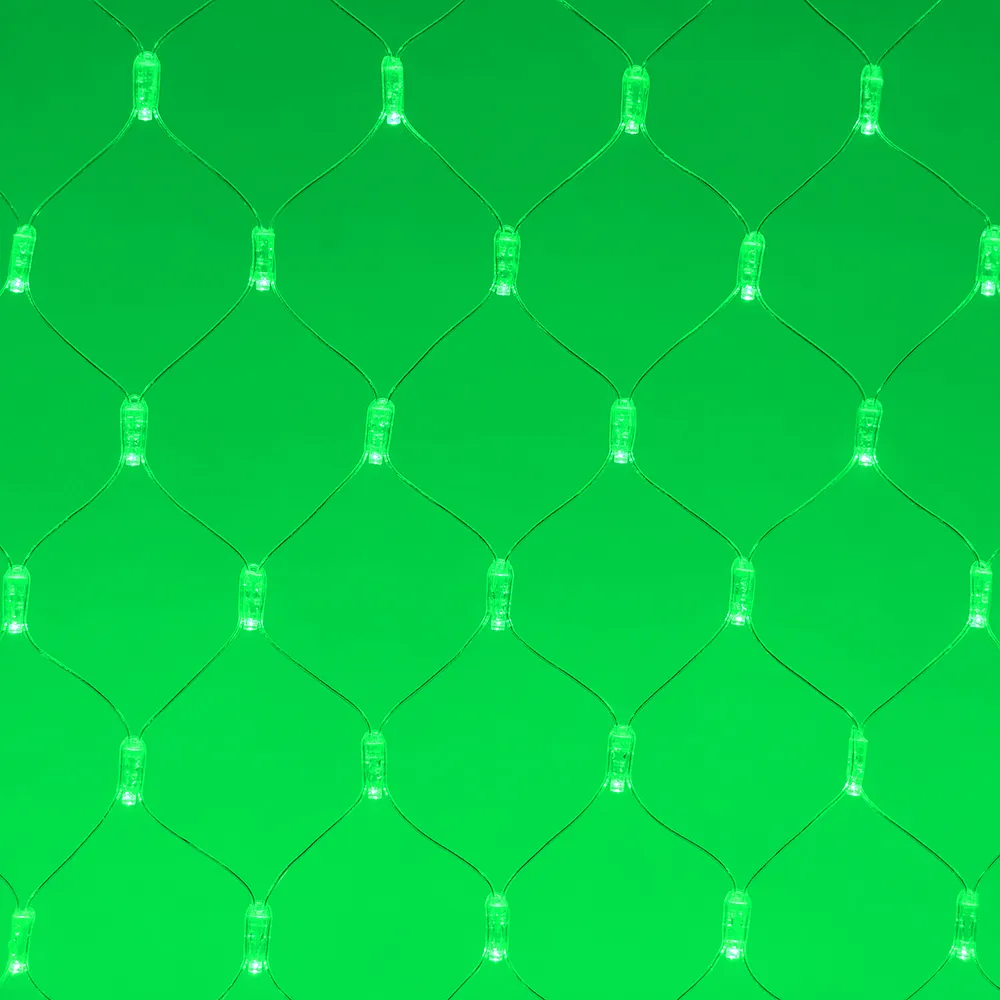 Светодиодная сеть Classic. 2000x1500 (длина 2000 мм, высота 1500 мм). Цвет свечения ЗЕЛЕНЫЙ. 288 светодиодов размером 7 мм со статическим и 8 динамическими эффектами свечения с резким световым рисунком (прозрачная вогнутая линза). Провод прозрачный, ПВХ. Питание 230 В, Мощность 18 Вт,защита IP65, применение в помещении и на улице под навесом Аксессуары для подключения и выбора режима свечения в комплекте.
