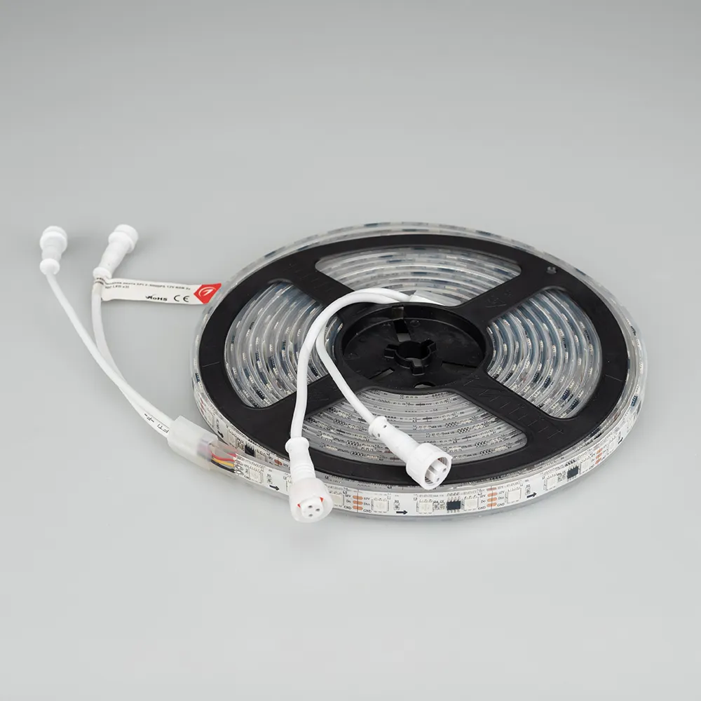 Герметичная лента «Бегущие огни» с драйвером 16703, в запрессованном силиконе, литая силиконовая трубка IP67, со СКОТЧЕМ 3M на обрат. стороне. Рекоменд-ся подводка пит-я с 2 сторон ленты. Длина 5м, 300шт LED RGB 5060, 20 pixel/m (1 pixel = 3 LED). Управление от внешнего контроллера SPI, без авторежима. Питание 12V, макс. мощн-ть 14,4 Вт/м (статический белый цвет). Ширина 12 мм. Герметичные круглые коннекторы.