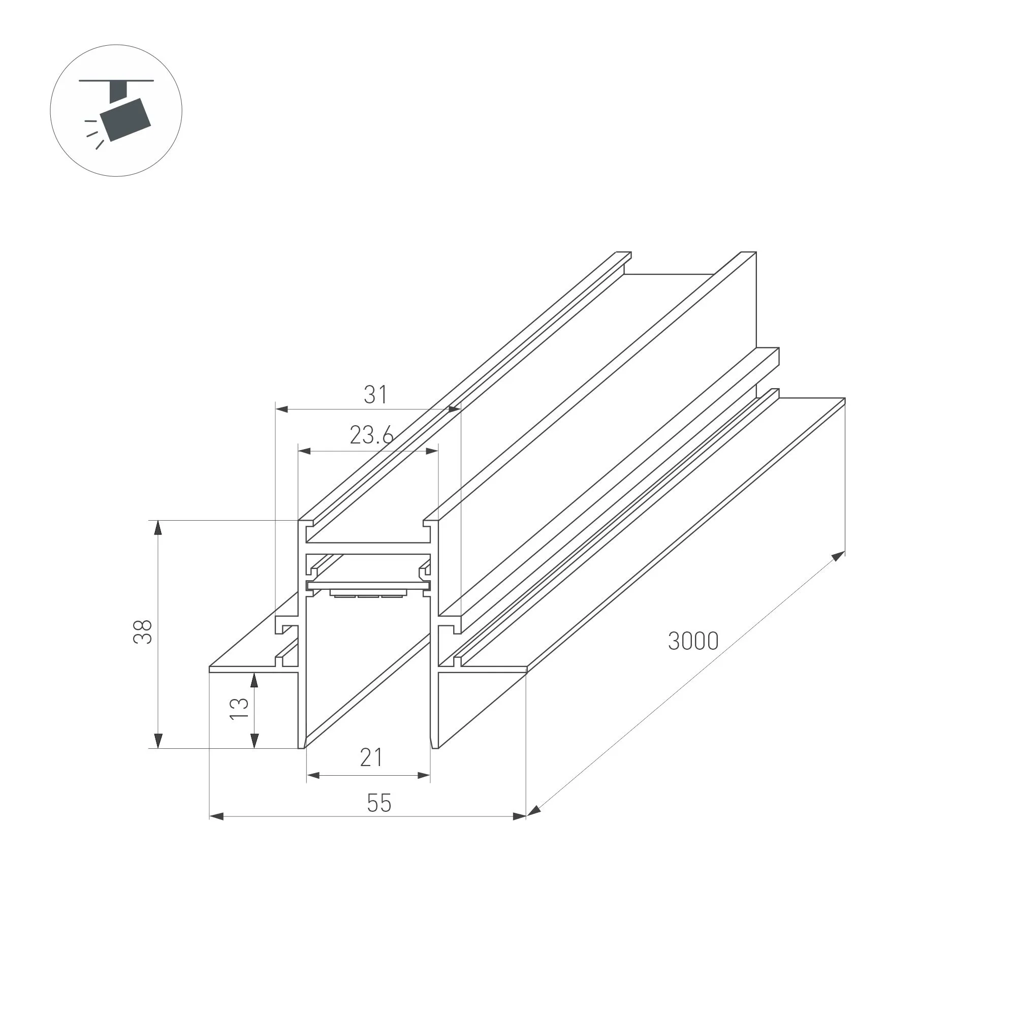 Встраиваемый магнитный трек с фланцем для монтажа в гипсокартонный потолок, длина 3000 мм. DC24V. Материал алюминий, цвет черный. Две заглушки в комплекте. Размер ДxШxВ: 3000x55x38 мм. Размер (с учетом заглушек и фланцев) ДxШxВ: 3003x55x38 мм. DC24V. Аналог 046286.