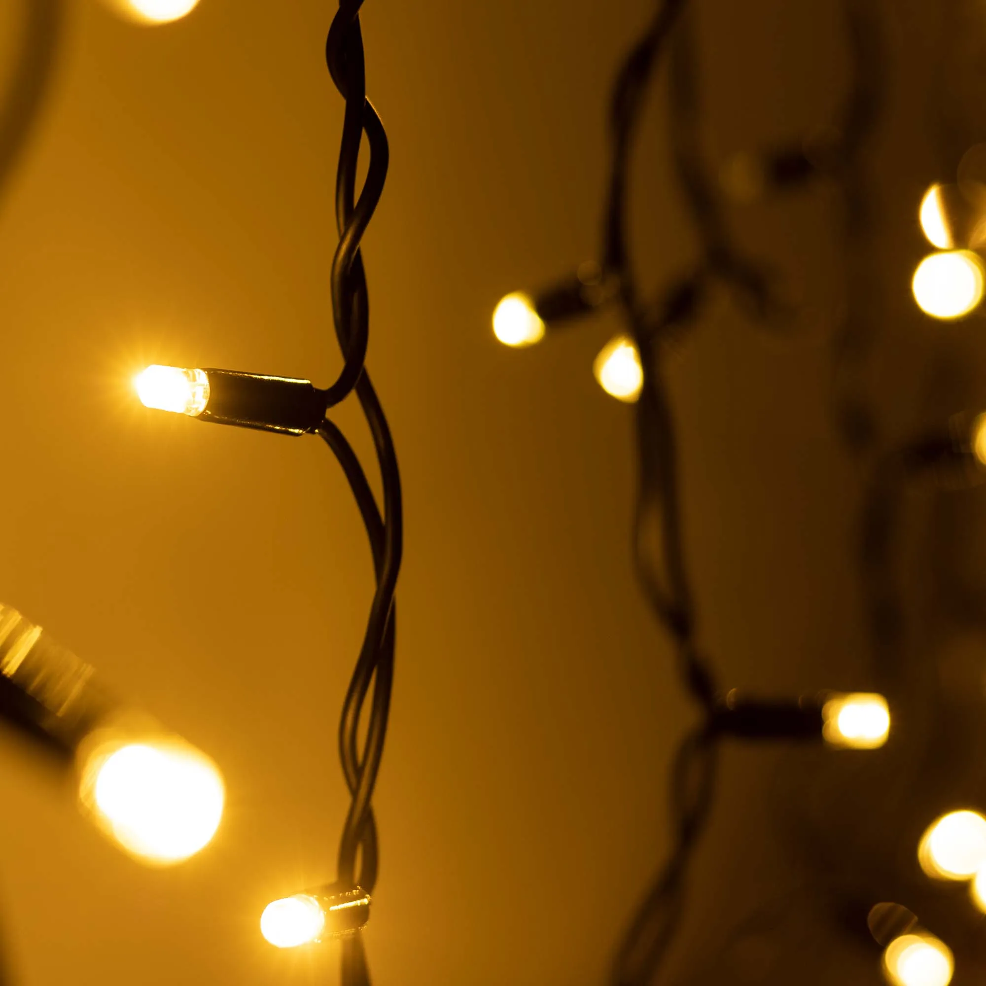 Светодиодная бахрома Pro. Размер 4000 мм (длина 4000 мм, по длине 32 нити высотой 200/600 мм). Количество светодиодов 128 шт размером 7 мм. Основной цвет свечения ТЕПЛЫЙ БЕЛЫЙ (3000 К), эффект мерцания редких точек ТЕПЛЫЙ БЕЛЫЙ (3000К) с мягким световым рисунком (выпуклая молочно-белая линза), соотношение светодиодов: 106 теплых постоянного свечения / 22 теплых с мерцанием. Эффект частого мерцания. Провод черный, каучук. Питание 230 В, Мощность 6 Вт, защита IP65, применение на улице под навесом. Аксессуары для подключения приобретаются отдельно.