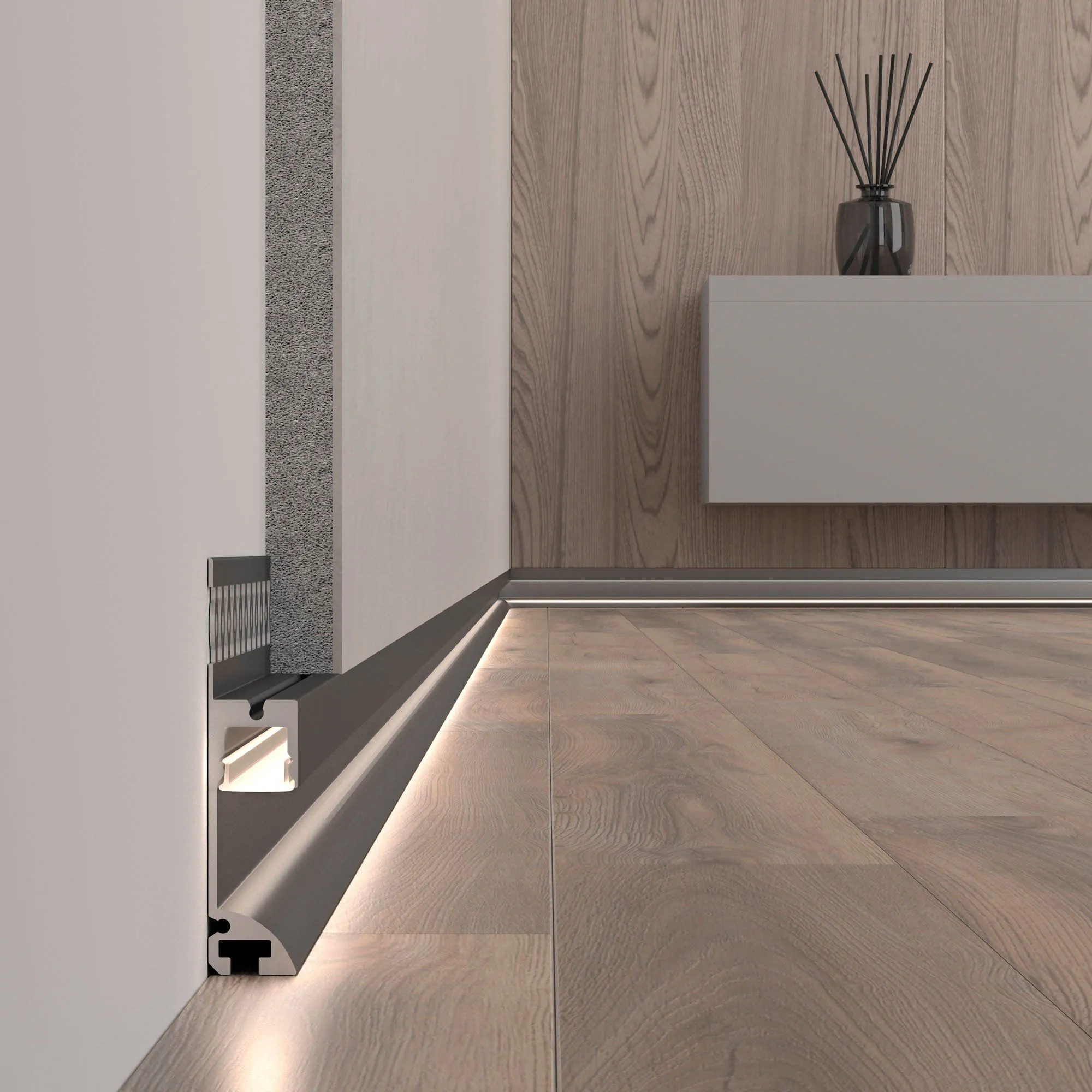 Алюминиевый профиль-плинтус для светодиодных лент и линеек. Цвет - черный RAL9005 (порошковая окраска). Габаритные размеры (L×W×H): 2000x12,8x60 мм. Ширина площадки для ленты 9,2 мм. Аксессуары приобретаются отдельно. Цена за метр.