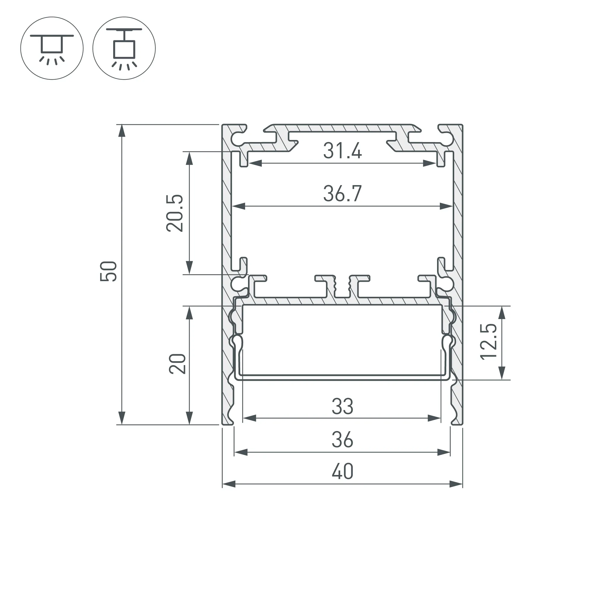 Алюминиевый анодированный профиль со съемной площадкой для светодиодной ленты в комплекте. Цвет - черный. Габаритные размеры (L×W×H): 2000x40x50.6 мм. Ширина площадки для ленты 33мм. Отсек для БП 31.4х20.5 мм. Возможность установки экрана на разных уровнях (три варианта). Экраны, заглушки и другие аксессуары приобретаются отдельно. Цена за 1 метр.