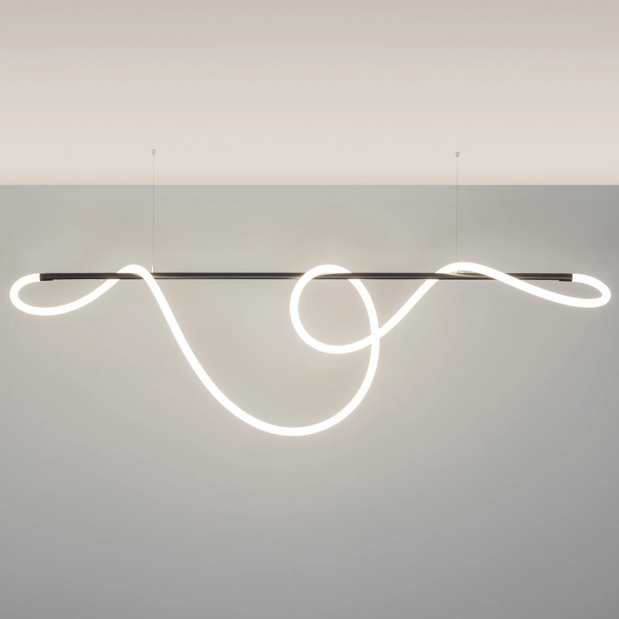 Подвесной светильник. Мощность 70 Вт, св. поток 4700 лм, 67 лм/Вт, дневной 4000 K, CRI>90, угол 360°, напряжение питания 230 В (в комплекте блок питания 230В/48В). Матовый белый фигурный корпус из силикона. Размер: диаметр 30 мм, длина 5000 мм. Монтаж на магнитный трек FLEX. Комплектующие: 021181(1) -1шт, 034063 - 2шт, 034062 - 1шт, 035391 - 1шт, 035385 - 1шт, 035388 - 1шт, коробка 035707.