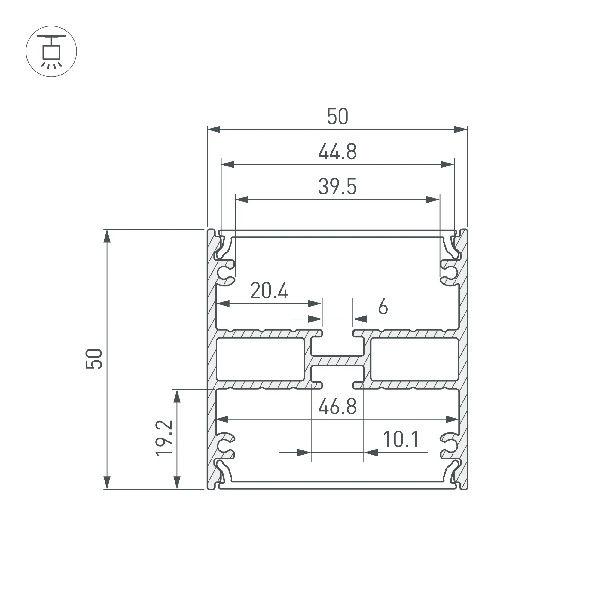 Алюминиевый анодированный профиль для светодиодных лент и линеек, свечение вверх и вниз. Цвет - чёрный. Габаритные размеры (L×W×H): 3000x50x50 мм. Ширина площадки для ленты 46,8 мм. Экраны, заглушки и другие аксессуары приобретаются отдельно. Цена за 1 метр.