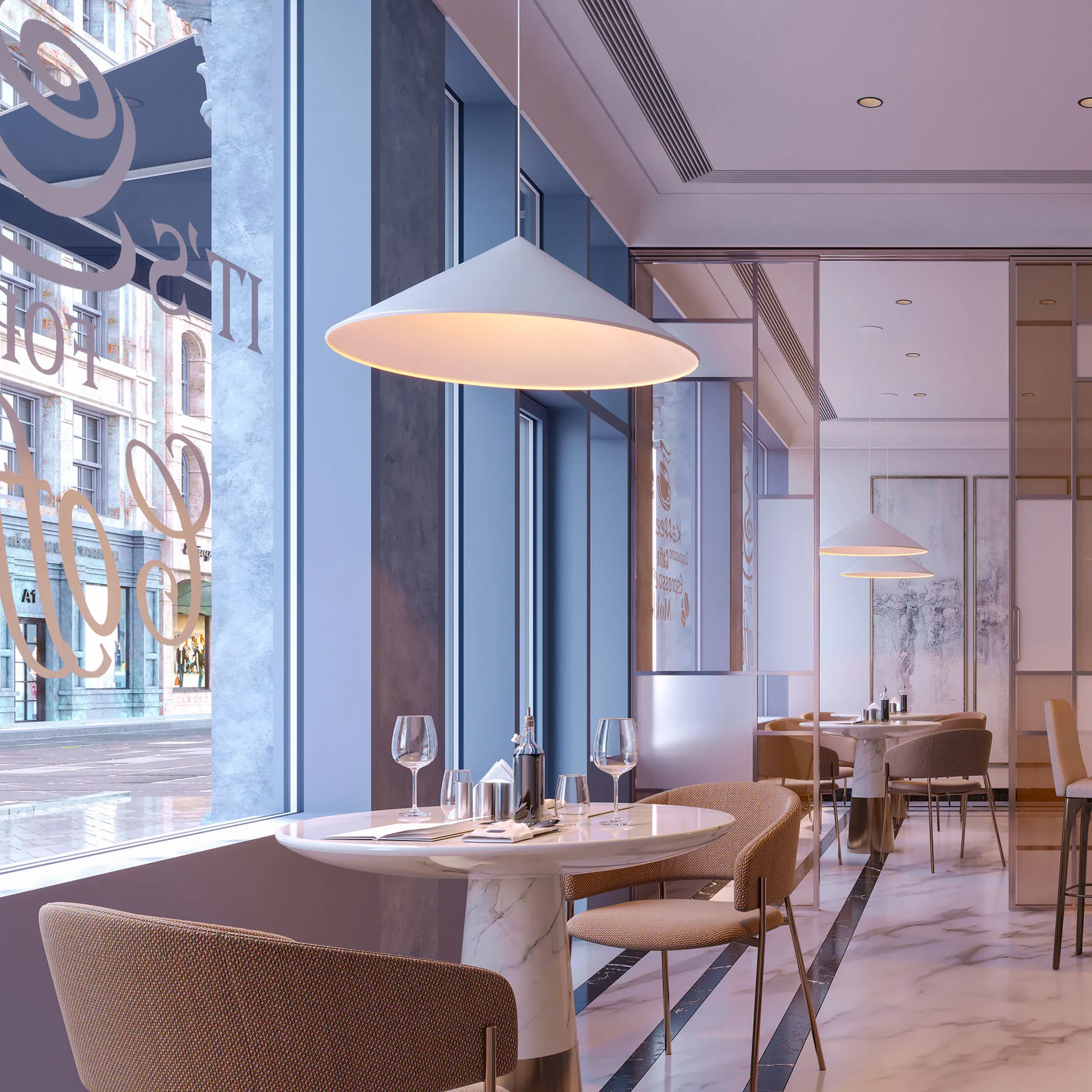 Подвесной светильник. Мощность 14 Вт, св. поток 1200 лм, 87 лм/Вт, теплый 3000 K, CRI>92, угол 36°, напряжение питания 230 В. Белый корпус из алюминия в форме конуса с белой внутренней поверхностью, линза-рассеиватель из PMMA, степень защиты IP20. Размер: диаметр 350 мм, высота 420 мм. Монтаж подвесной, длина подвеса 2000 мм, регулируемая. В комплекте 2 вида чаш. Габариты встраиваемой чаши: Ø 80x23 мм. Габариты накладной чаши Ø140x55 мм. Драйвер 27-42 В, 350 мА, пульсация <1%. Управление по TRIAC.