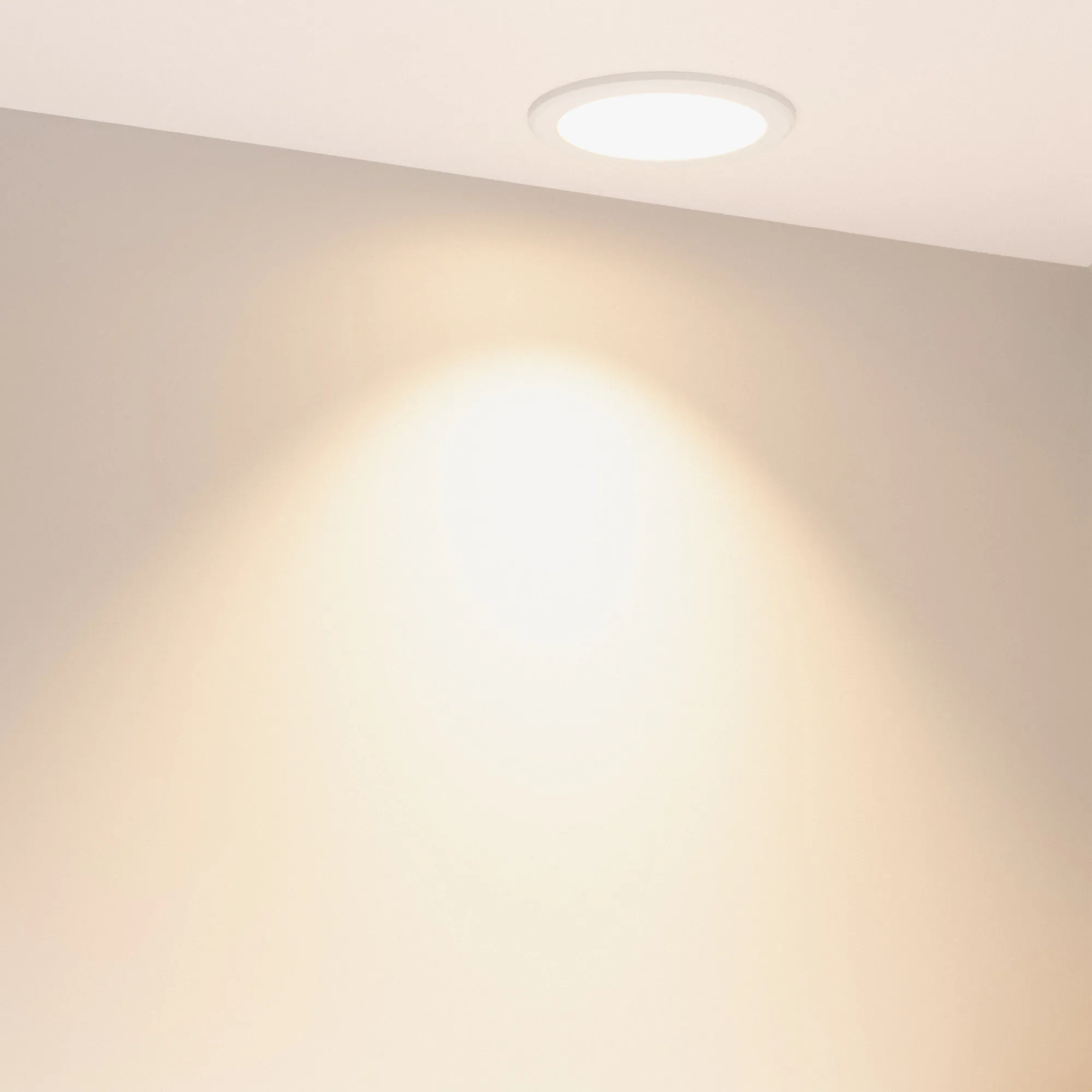 Встраиваемый светильник даунлайт с изменяемой мощностью и цветовой температурой. Мощность 6-9 Вт, св. поток 620-890 лм, 100 лм/Вт, цветовая температура 3000-4000-5700 K, CRI>90, угол 40°, напряжение питания 230 В. Белый круглый корпус, степень защиты IP54. Размер: диаметр 106 мм, высота 67 мм. Монтаж встраиваемый, установочное отверстие: диаметр 90-98 мм. TRIAC-драйвер, пульсация <1%.