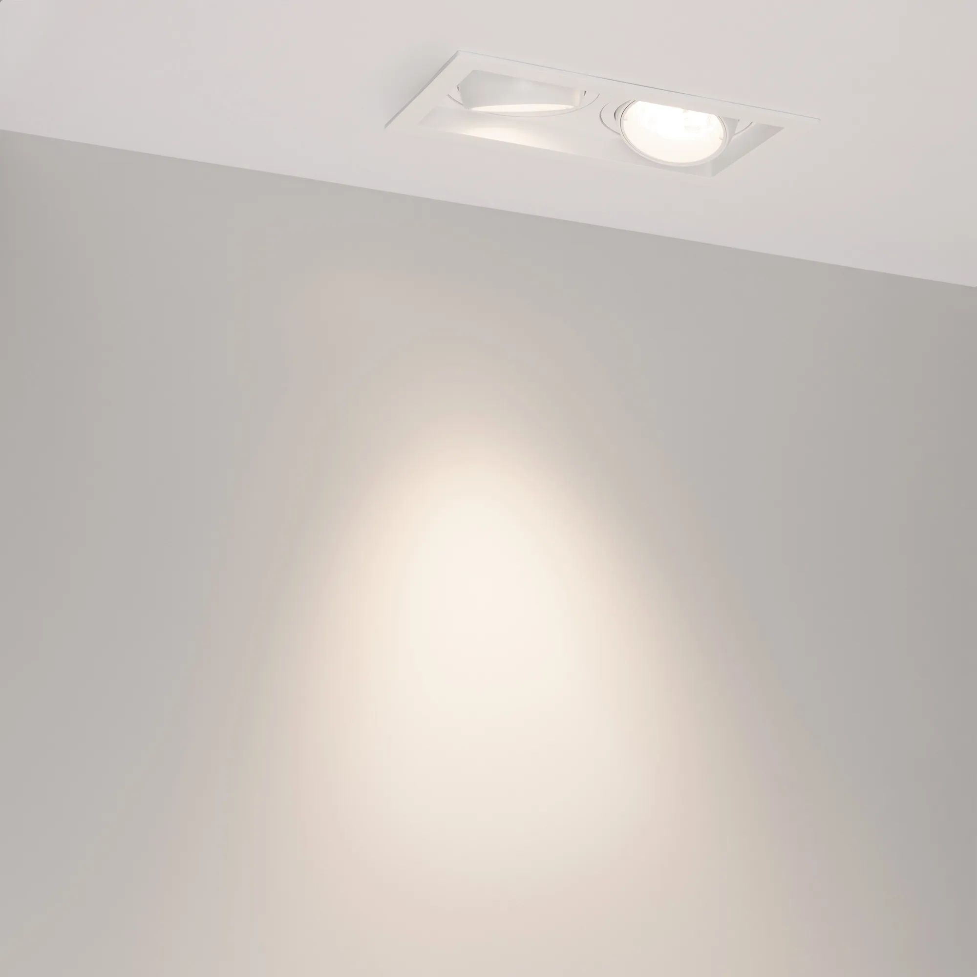 Встраиваемый карданный светильник. Мощность 2х20 Вт, св. поток 4264 лм, 106 лм/Вт, дневной 4000 K, CRI>92, угол 40°, напряжение питания 230 В. Белый корпус из алюминия, черная вставка, степень защиты IP20. Размер: длина 210 мм, ширина 117 мм, высота 105 мм. Монтаж встраиваемый, установочное отверстие: длина 190 мм, ширина 95 мм. Драйвер 24-42 В, 500 мА, пульсация <2%.